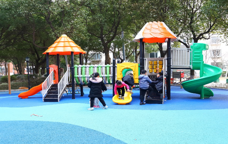 排施工单位历时两个多月,打造了一个六百平方米标准的游乐场地,社区居民都非常的满意。
